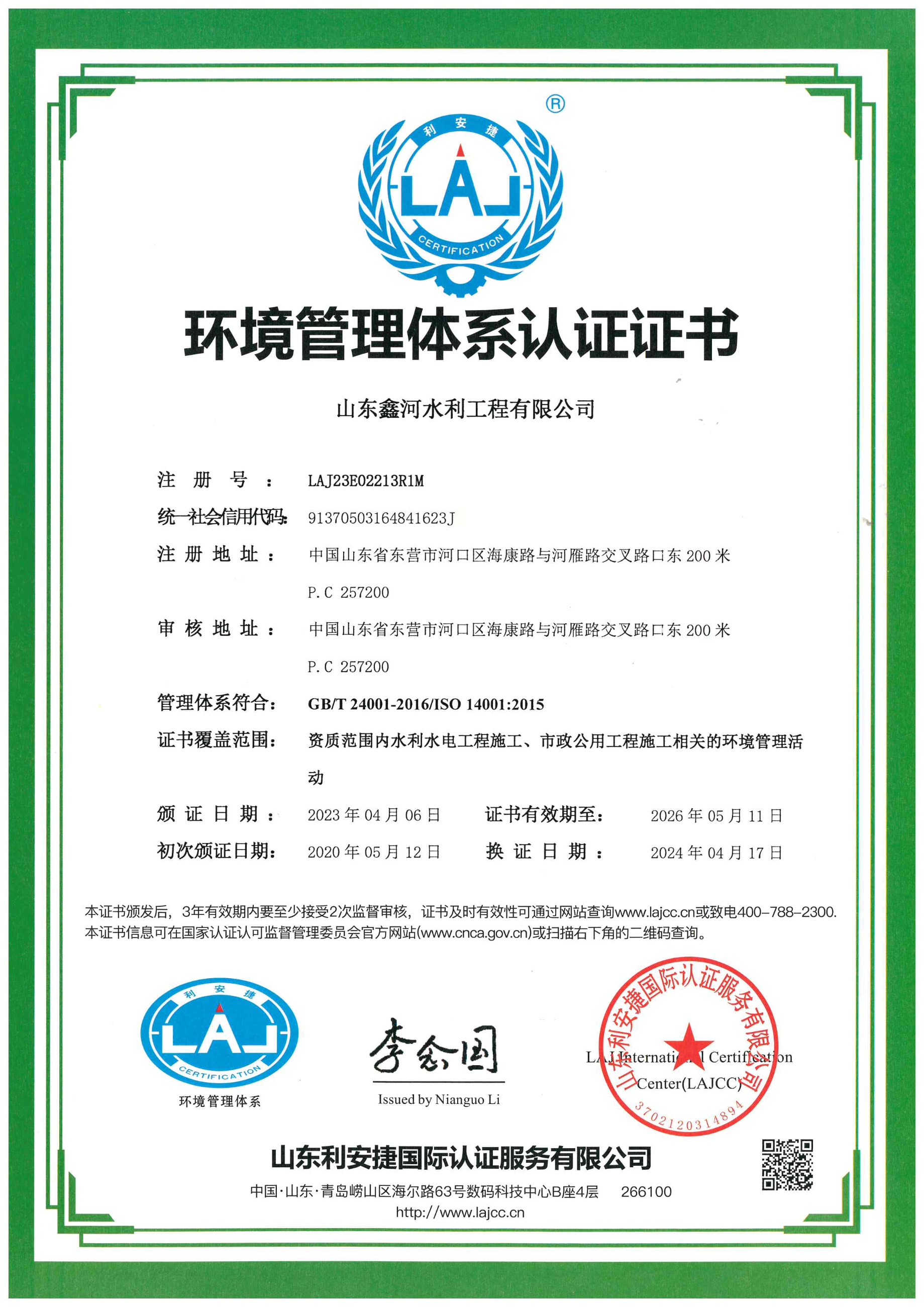 環(huán)境管理體系認證證書