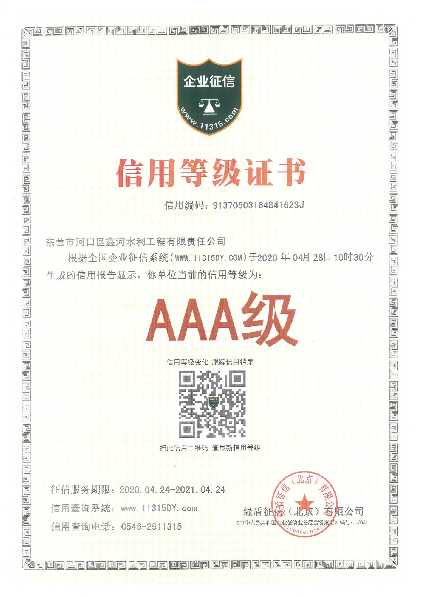 AAA級(jí)信用等級(jí)證書(綠盾征信)